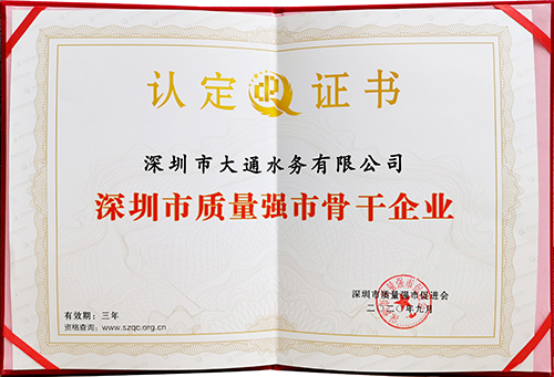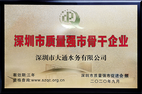 近日,由深圳市質量強市辦指導、深圳市質量強市促進會主辦的“學習習近平總書記在深圳經濟特區(qū)建立40周年慶祝大會上重要講話精神暨深圳企業(yè)高質量發(fā)展分享會”成功召開,大會對第七屆“深圳市質量強市金質獎章”獲獎企業(yè)家和第五批“深圳市質量強市骨干企業(yè)”進行了表彰。深圳金達環(huán)境控股有限公司旗下的深圳市大通水務有限公司,憑借濃厚的質量文化、突出的質量管理能力、深厚的質量基礎優(yōu)勢、以及對深圳城市質量提升和質量惠民做出的貢獻,獲頒“深圳市質量強市骨干企業(yè)”殊榮。